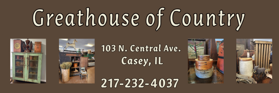 Greathouse of Country Early American Country Antiques Love authentic, original early American country antiques? Then, you need to come visit the shop! It is filled with country antiques from Illinois, Indiana, Ohio, Kentucky and more. We are located just off I-70 at the Casey Illinois 129 exit. Hours: Tuesday - Saturday 10:00 am - 4:00 pm